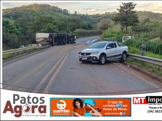 Caminhão carregado de celulose tomba após colisão lateral na MG-230 em Rio Paranaíba