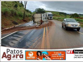 Caminhão bate em barranco e tomba na BR-365, próximo à Curva da Morte