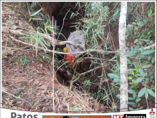 Corpo de Bombeiros resgata bezerro preso em grota de 12 metros de profundidade na zona rural de Tiros