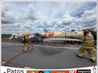Caminhão-tanque com diesel pega fogo na BR-365